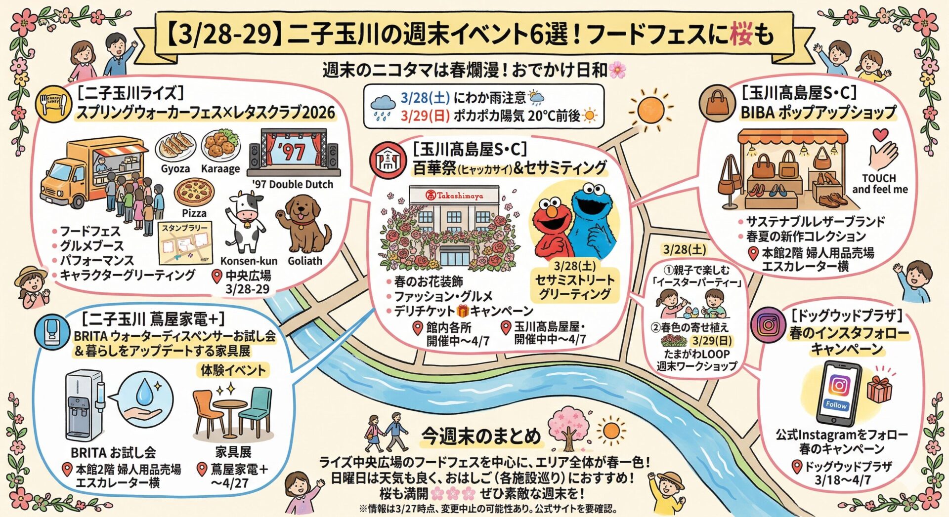 【今週末の二子玉川】注目のイベント&ポップアップ(3/28〜3/29) 桜がいよいよ満開を迎えそうな今週末の二子玉川。土曜日はにわか雨の可能性がありますが、日曜日は最高気温20℃前後のポカポカ陽気で絶好のおでかけ日和になりそうです。ライズの中央広場ではフードフェスが開催され、高島屋は春の花で彩られた「百華祭」の真っ最中。この週末、ニコタマの街はいつも以上ににぎやかになりそうですよ。 1. [二子玉川ライズ] スプリングウォーカーフェス×レタスクラブ2026 開催期間: 2026/03/28(土)〜 03/ ...