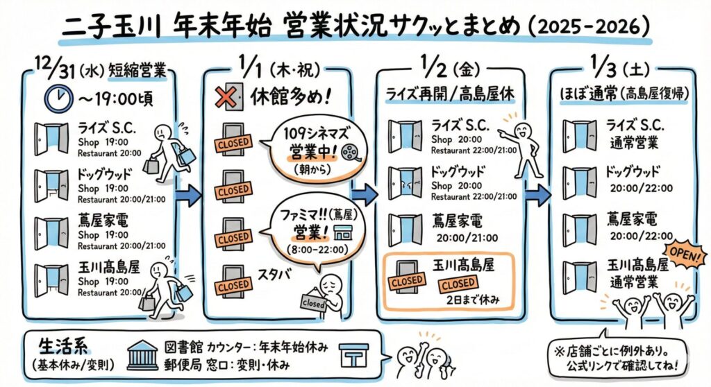 - 1/2(金):二子玉川ライズ周辺は 通常寄りで再開/高島屋はまだ休館