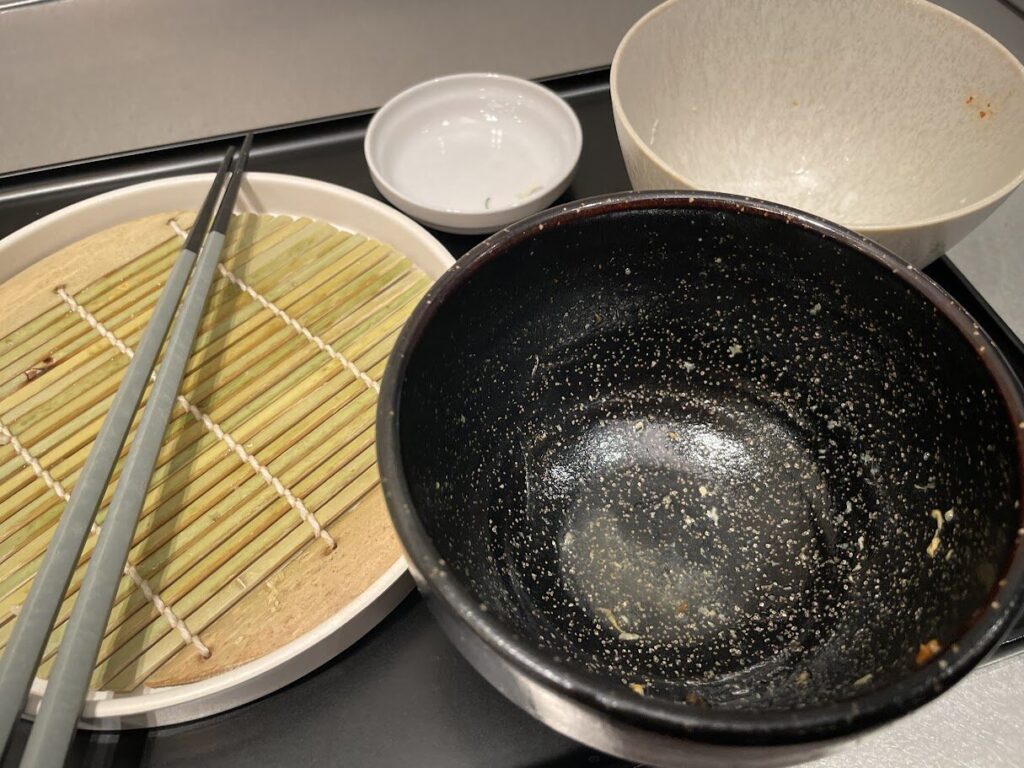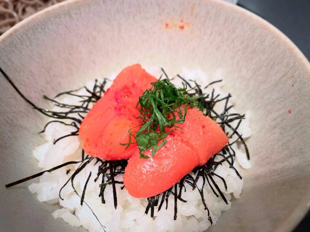 何を食べるか悩んだが、炭かおる親子つけ汁そばが気になって注文!明太子ごはんもオプション追加