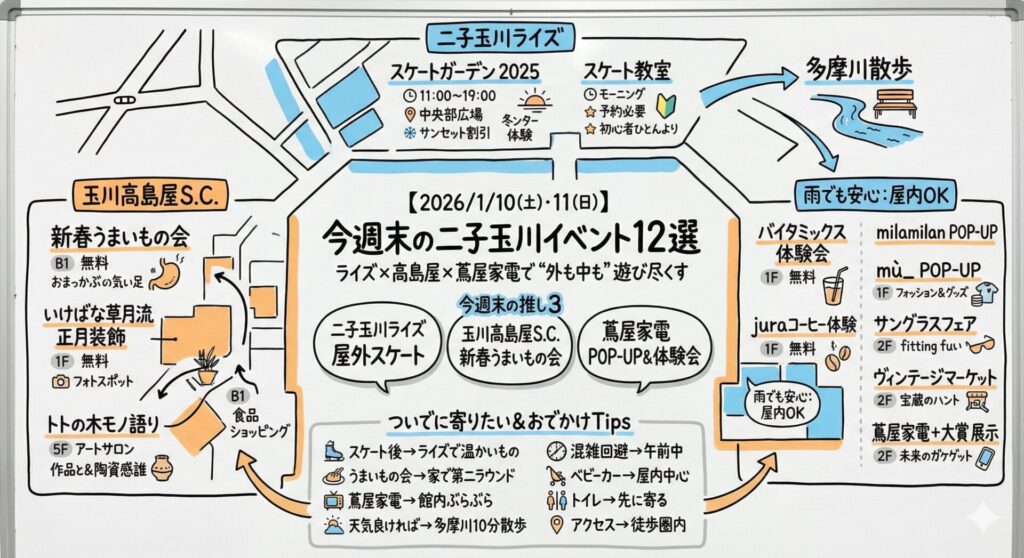 今週末(1/10(土)・1/11(日))の二子玉川、冬らしくキリッと冷えつつも、歩くほど気持ちよくなりそうな空気感。二子玉川ライズ〜玉川高島屋S.C.〜多摩川沿いをふらっとつなぐだけで、ちゃんと“週末した感”が出るやつです。天候や運営都合で変更の可能性もあるので、出発前に公式ページもサッと確認してね。