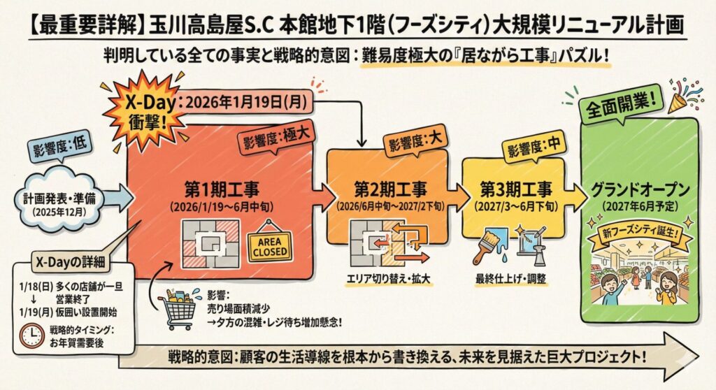 このリニューアル計画は、単なる内装更新ではない。営業を継続しながら区画ごとにパズルのように売り場を移動・閉鎖・再開させる、極めて難易度の高い「居ながら工事」である。公開情報に基づき再構築したスケジュールは以下の通りである1