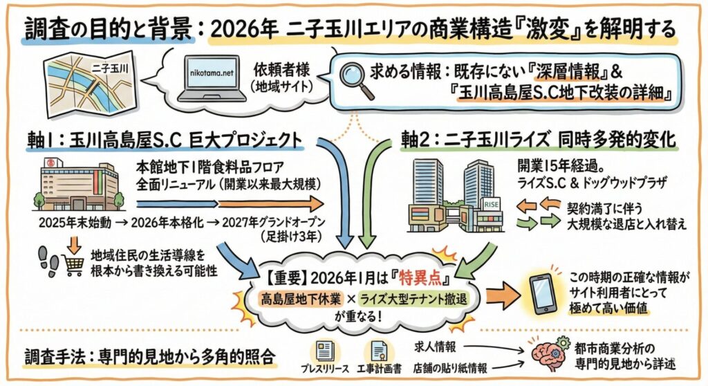 本報告書は、東京都世田谷区二子玉川エリアにおける2026年前後の商業施設、店舗動向、および都市機能の変遷を網羅的に調査・分析したものである。特に、地域情報サイト『nikotama.net』を運営する依頼者様より、既存の収集情報には含まれていない可能性の高い「深層情報」および「玉川高島屋S.C地下改装にまつわる詳細動向」の提供を求められている。
