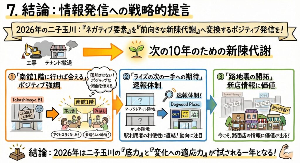 2026年の二子玉川は、高島屋の地下工事とライズのテナント撤退という「ネガティブな要素」が表面化しやすい年である。しかし、これらは全て、次の10年のための「前向きな新陳代謝」である。