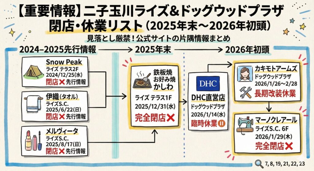 加えて、駅直結の商業施設「二子玉川ライズ・ショッピングセンター(以下、ライズS.C)」および「二子玉川ライズ・ドッグウッドプラザ」においても、開業から15年近くが経過し、テナント契約の満了に伴う大規模な退店と入れ替えが同時多発的に発生している。特に2026年1月は、高島屋の地下改装による休業と、ライズS.Cでの大型テナント撤退が重なる「特異点」となっており、この時期の情報の正確性がサイト利用者にとって極めて高い価値を持つことになる。