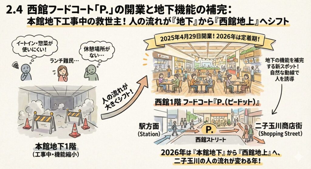 2026年の時点では、この「P.」が開業から1年足らずの新スポットとして定着し始めている時期である。地下のイートインや惣菜売り場が工事で使いにくい中、ランチ難民や休憩場所を求める客は、自然とこの西館「P.」へと流れる動線設計となっている。