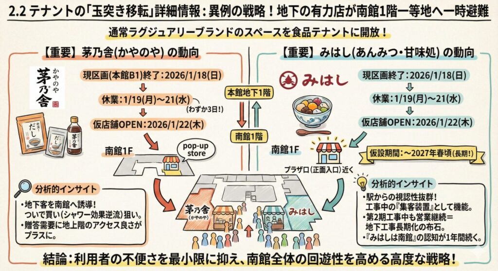 本館地下1階の改装工事に伴い、2026年1月19日よりエリアの封鎖が開始される。これに伴い、「茅乃舎」や「みはし」といった集客力の高いテナントが、異例の措置として南館1階などの地上階へ「仮店舗」として移転する。地下の顧客を地上へ吸い上げるこの戦略は、館内の回遊性を劇的に変化させる3。