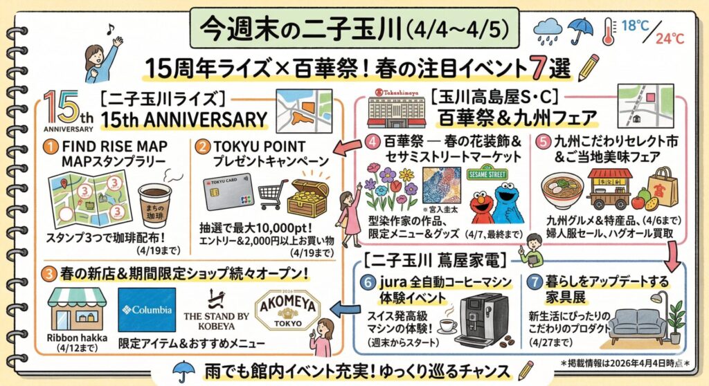 今週末は、二子玉川ライズの15周年アニバーサリーと玉川高島屋S・Cの百華祭が同時に楽しめる、なんとも贅沢な週末です。特に百華祭は4/7まで、ライズのインスタフォローキャンペーンも4/7までなので、今週末がラストスパート。土日とも傘が手放せないお天気ですが、館内イベントが充実しているのでむしろゆっくり巡るチャンスかもしれません。雨の日こそ、屋根のある二子玉川の商業施設でのんびりお買い物を楽しんでみてください。