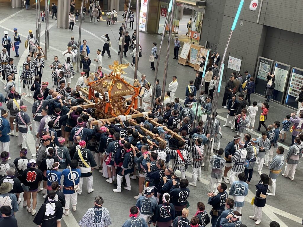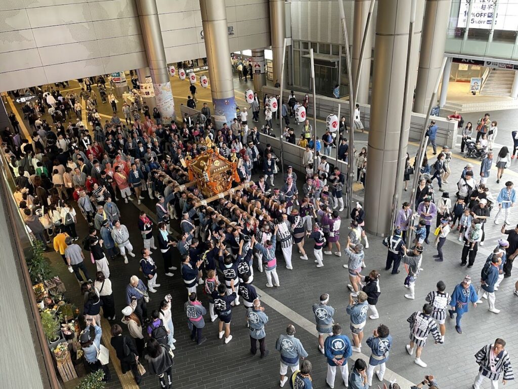 玉川神輿が二子玉川エリアを巡行し、駅前は法被と手拭いの海に。