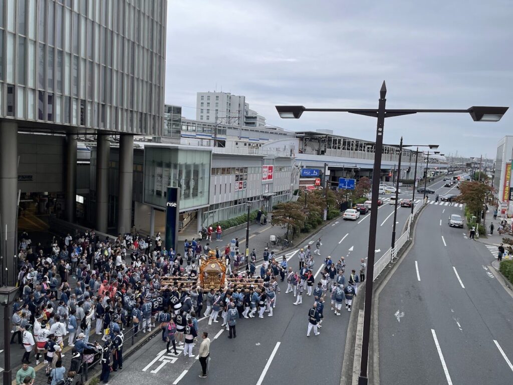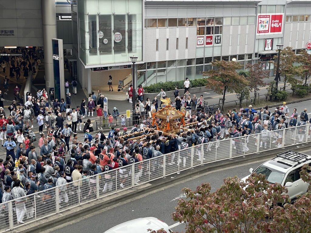 黄金の鳳凰をいただく玉川神輿が、駅前からライズのガレリア、駅前通りへと力強く巡行しました。
