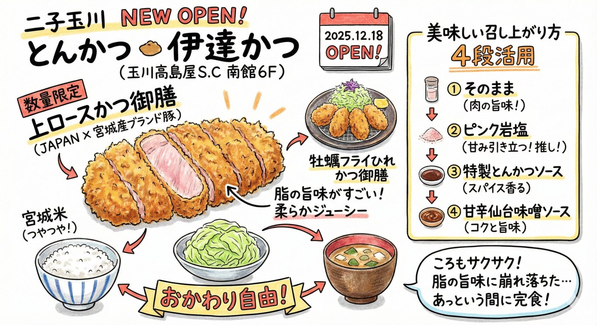 二子玉川の開店情報です。玉川高島屋S.Cの本館6階に、新しいとんかつ屋さん「とんかつ 伊達かつ」が2025年12月18日(木)にオープンします!場所は本館の6階、レストランフロアの一角です。 ■「とんかつ 伊達かつ」とは? 「伊達かつ」の最大の特徴は、宮城県産の銘柄豚「JAPAN X」と、鹿児島県産の「黒豚」が味わえること。 特に「JAPAN X」は、脂の旨みと柔らかさが特徴のブランド豚だそうで、とんかつ好きにはたまらないお店になりそうです。 ■メニューや雰囲気 王道のロースかつやひれかつはもちろん、ペア ...