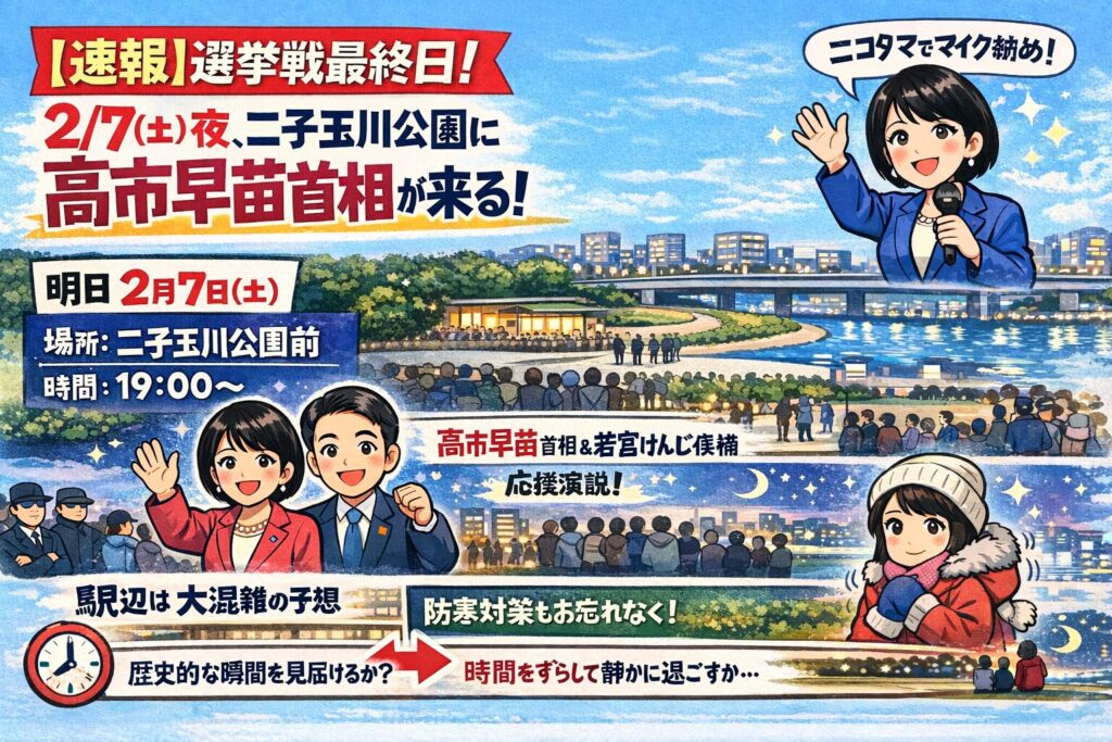 【速報】選挙戦最終日!2/7(土)夜、二子玉川公園に高市早苗首相が来るらしい!「マイク納め」の舞台はニコタマ